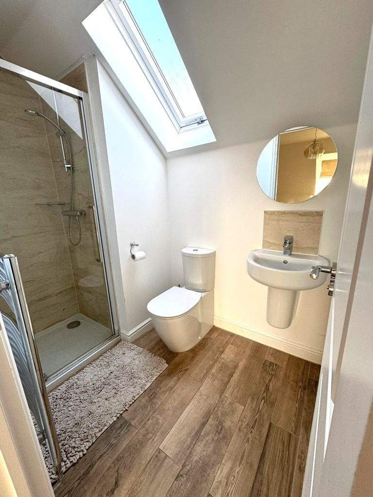 Ensuite - 7' 9'' x 5' 0'' (2.38m x 1.53m) Velux style window to the rear aspect, shower cubicle, low level wc, wash hand basin, heated towel rail and laminate flooring