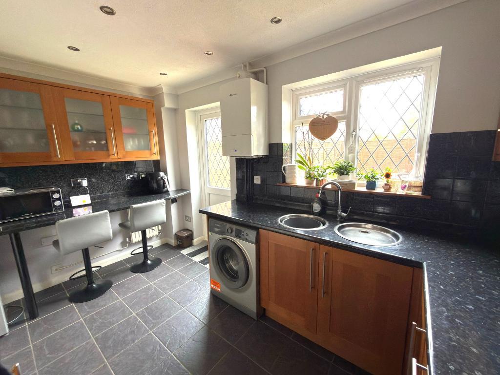 Kitchen - 12' 5'' x 8' 4'' (3.8m x 2.55m) Double glazed window to the rear aspect, double glazed door to the rear garden, range of wall & base level units, inset sink unit, built in oven & hob, breakfast bar, plumbing for washing machine, wall mounted boiler, radiator and tiled flooring